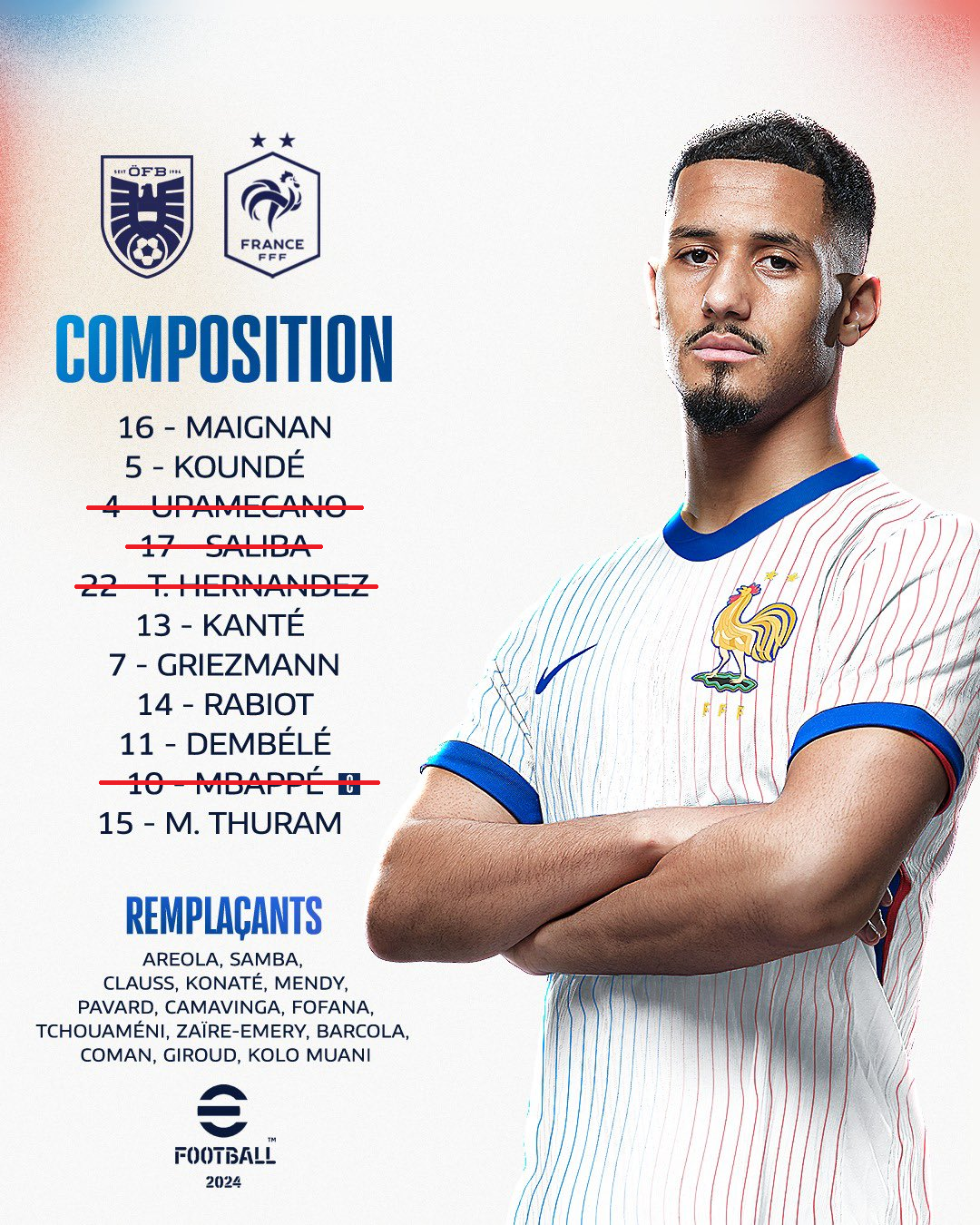 Со сломанным носом Килиана всё ясно, но на сегодняшней тренировке сборной Франции в основной группе отсутствовали и другие игроки стартового состава. Тео Эрнандес ограничился велосипедом, Вильям Салиба 15-минутным лёгким бегом по дорожке, а Дайо Упамекано остался в тренажёрном зале. Все 3 защитника имеют повреждения, а через 2 дня французам играть с Нидерландами в матче за 1-е место в группе.