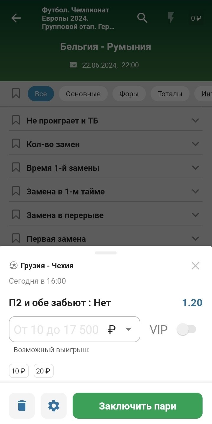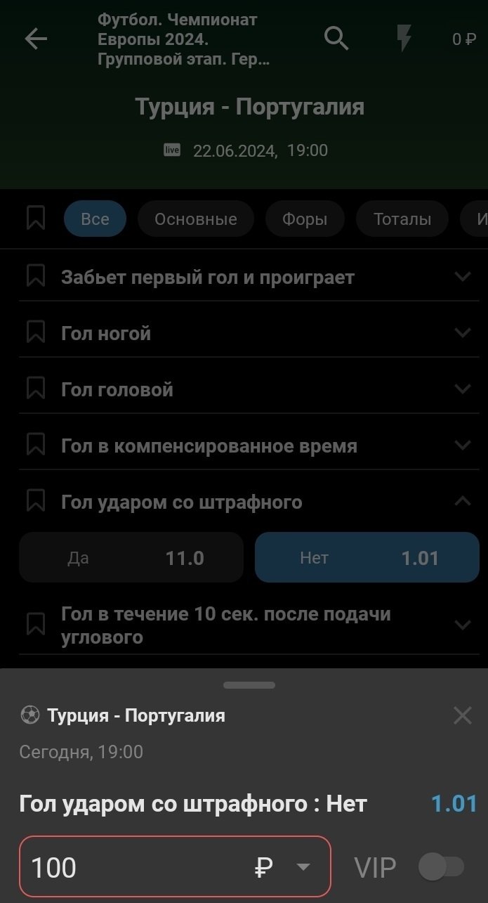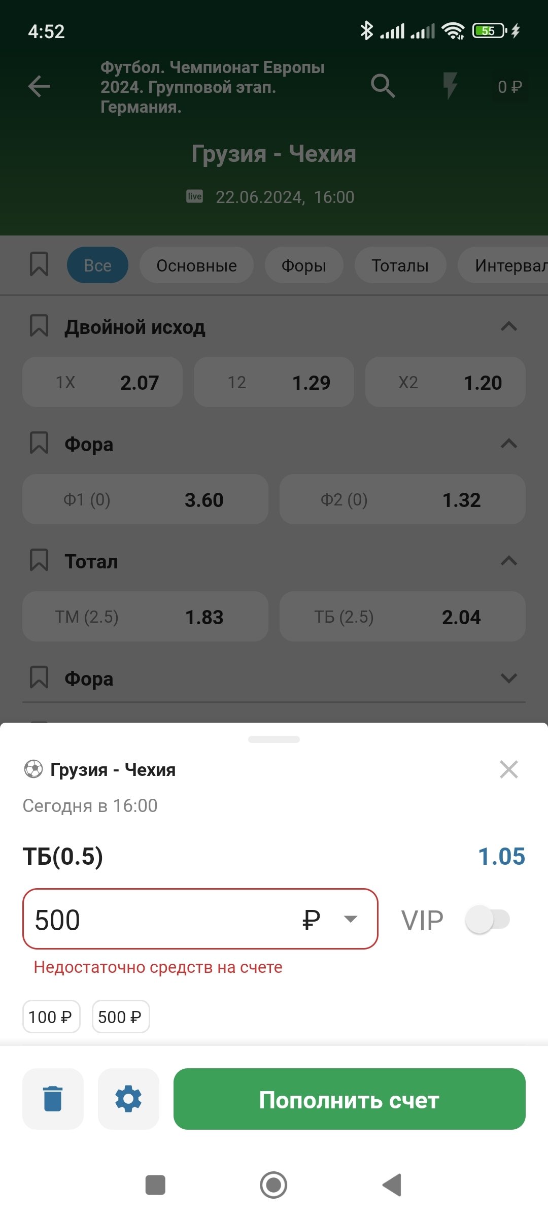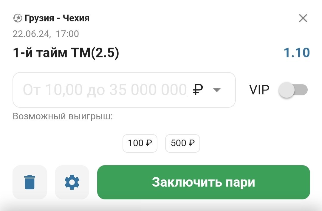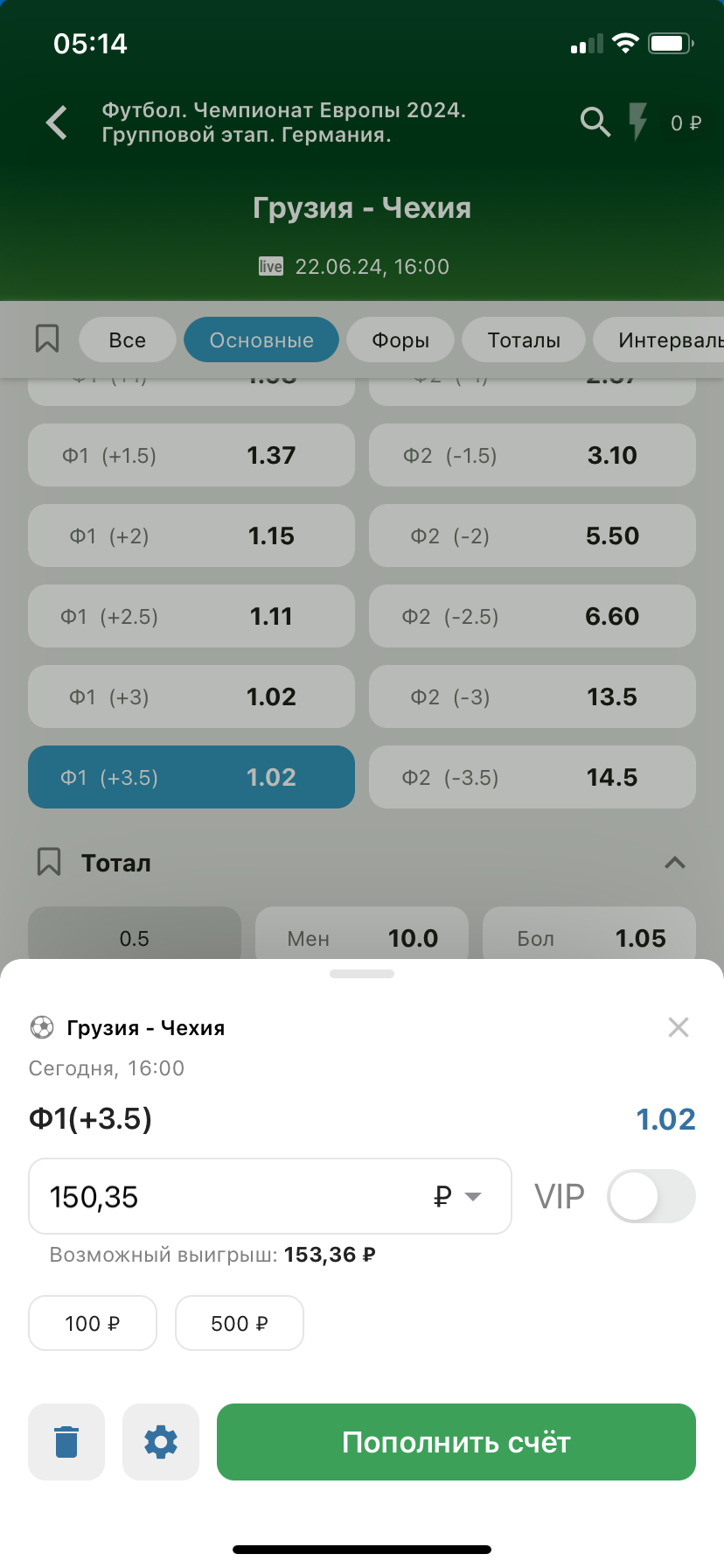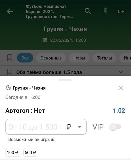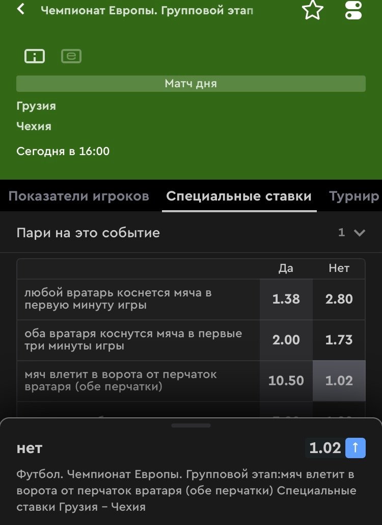 Например, вы ставите на ТБ 0,5 в матче Грузии и Чехии за 1.05. Если они сыграют 0:0, то ваша ставка проиграет, и, следовательно, вы претендуете на фрибет. А вот если грузины и чехи забьют хотя бы 1 гол, то вы выиграли, фрибет не полагается.