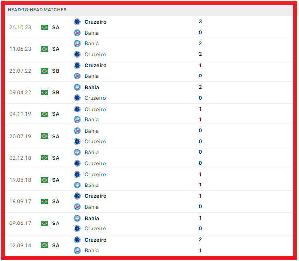 Хозяева стабильно с набранными очками с 2014-го. За это время клубы провели 11 матчей, в 6 из них победу одерживали хозяева (4 раза «Крузейро», дважды «Байя»), в 5 сыграли вничью (от 0:0 до 2:2).