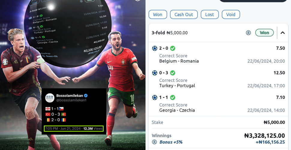 Вчера, 22 июня, 5 тысяч нигерийских найр (285 российских рублей) полетели на 3 точных счёта в матчах чемпионата Европы. Коэффициент экспресса — 666, а выплата с учётом бонуса (5%) составила 3,5 миллиона найр (200 тысяч рублей).
