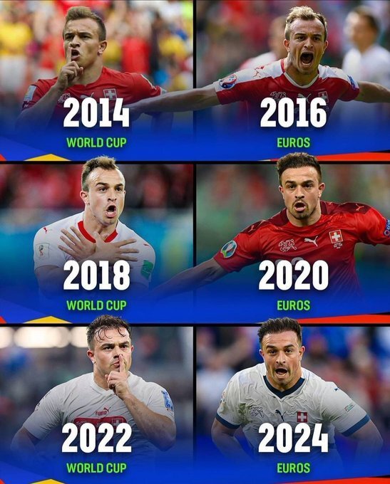 Швейцарец забивает на каждом из 6 последних ЧМ и Евро, начиная с чемпионата мира 2014 года. Никто другой не имеет столь же длинной серии, даже Роналду — португалец на этом евро, в отличие от Джердана, ещё не забивал, а значит — не продлил серию, тянущуюся с Евро-2004. В 3-м туре против сборной Германии: