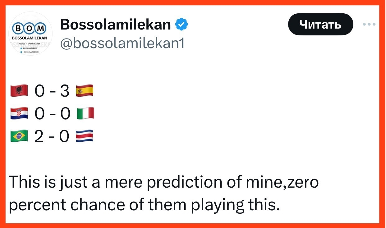 Правда к посту нигериец оставил странную подпись: «Это лишь мой прогноз. Шансов на то, что команды так сыграют, нет».