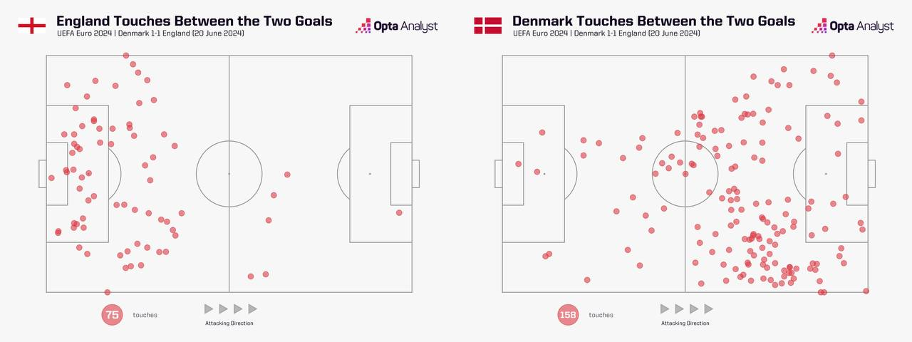 В остальных 20 матчах владение Англии было не выше 65%, а в среднем — лишь 54,7%. Как играет Англия Саутгейта на Евро-2024 — мы уже поняли, но продвинутая статистика отражает это ещё ярче. На картинке — касания мяча игроками сборных Англии и Дании между голами Кейна и Юлманна: открыв счёт, англичане фактически отдали мяч сопернику и в следующие 15 минут совершили 69 из 75 касаний на своей половине поля. Датчане встречались с мячом в этом интервале вдвое чаще, и большая часть касаний была как раз на чужой половине.