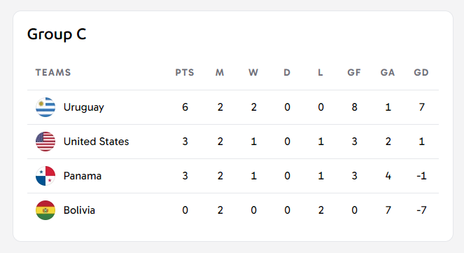 Следующая ситуация образовалась в группе C: Боливия проиграла 2 матча с общим счётом 0:7. Так как на Кубке Америки в группе решает разница, а не лички — шансы на выход ЯКОБЫ есть. Но на самом деле нет: придётся победить Панаму со счётом 8:0 и надеяться, что почти немотивированный Уругвай обыграет США. Вероятность подобного даже считать необязательно — по-хорошему, это невозможно.