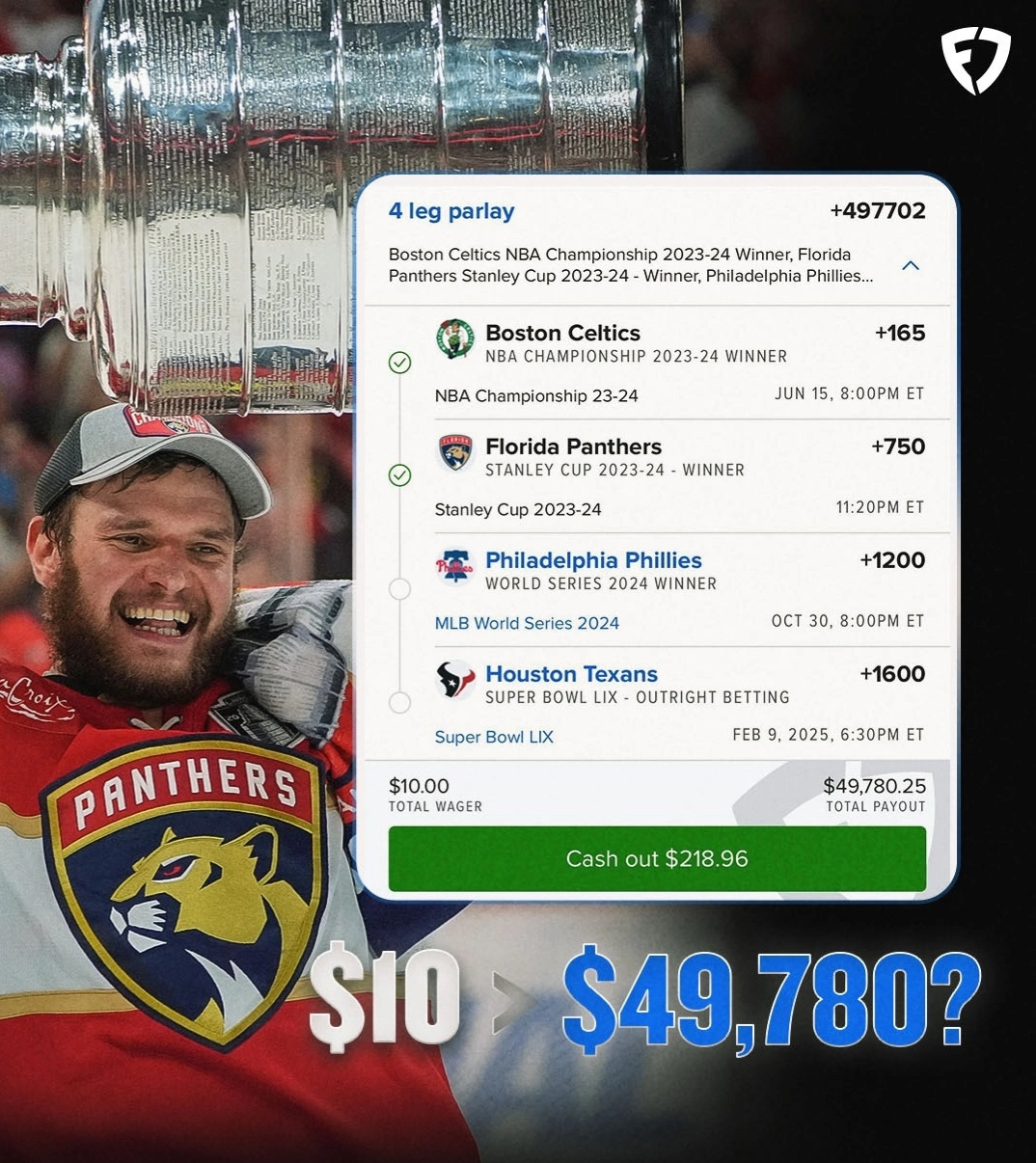 Кто-то зарядил экспресс на 10 долларов с коэффициентом 4978.02. Пока он неспешно едет к победе — «Селтикс» выиграли НБА, а «Флорида» — Кубок Стэнли. Осталось подождать всего 8 месяцев до финалов МЛБ и Супербоула, чтобы оформить доезд, но ставки очень смелые: