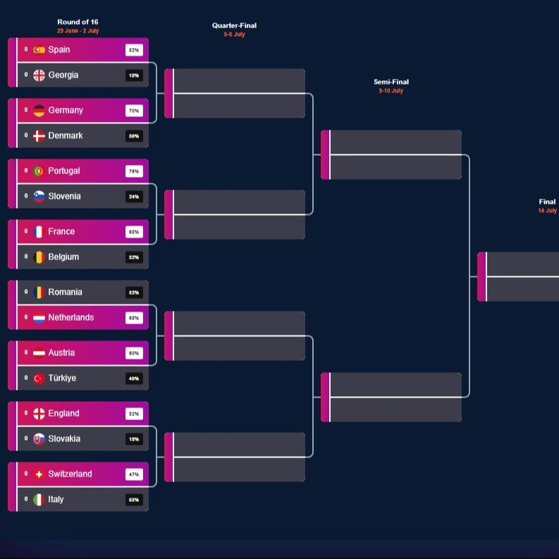 А мы напоминаем, что предикт Opta на победителей пар 1/8 до сих пор работает безотказно — даже проход Швейцарии, которую букмекеры котировали андердогом против Италии.