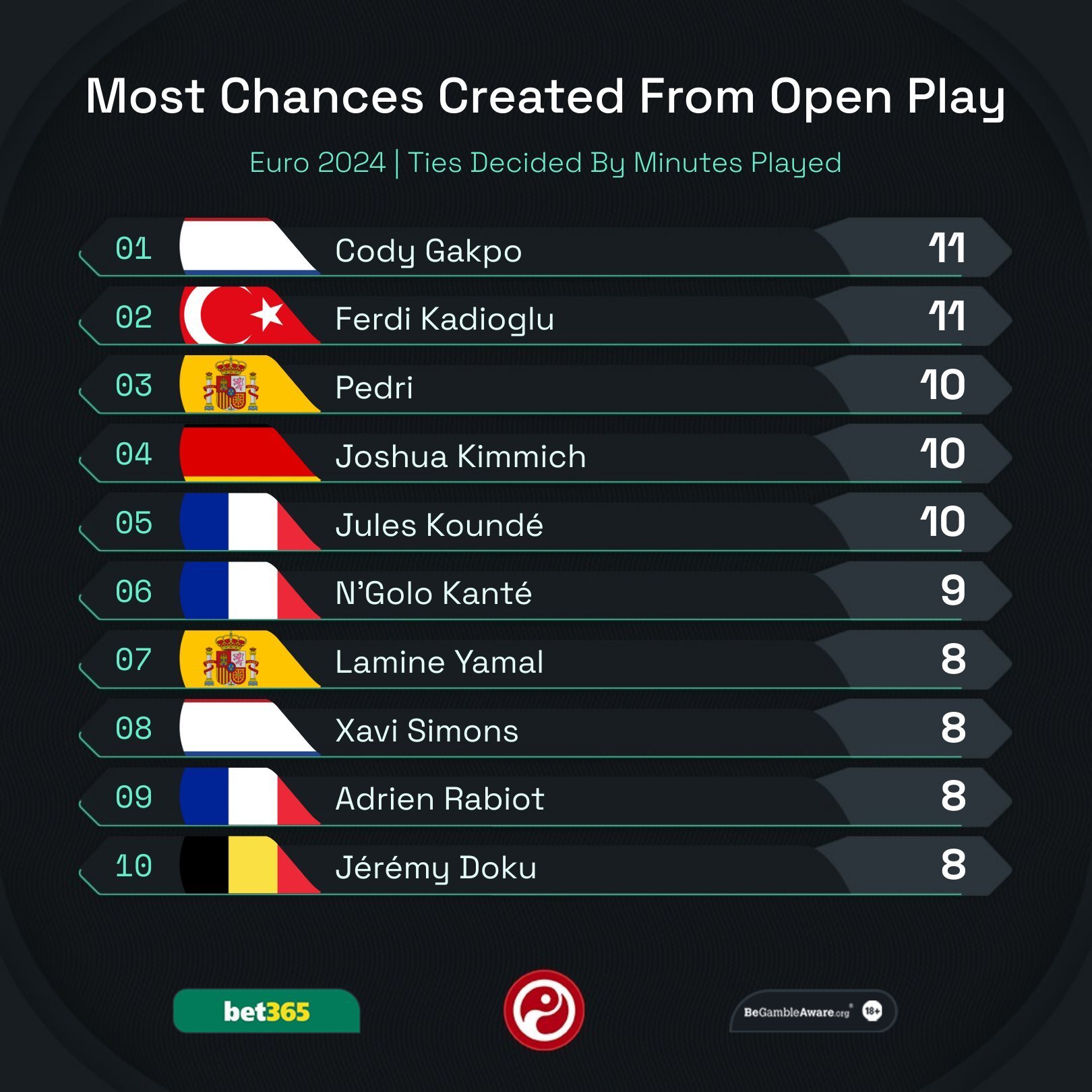 Гакпо играет на острие Нидерландов — у него 3 забитых мяча + голевая передача. Кадиоглу — защитник Турции. Его забеги на регулярной основе начинают атаки турков, но голевых действий, что странно, у Ферди пока нет.