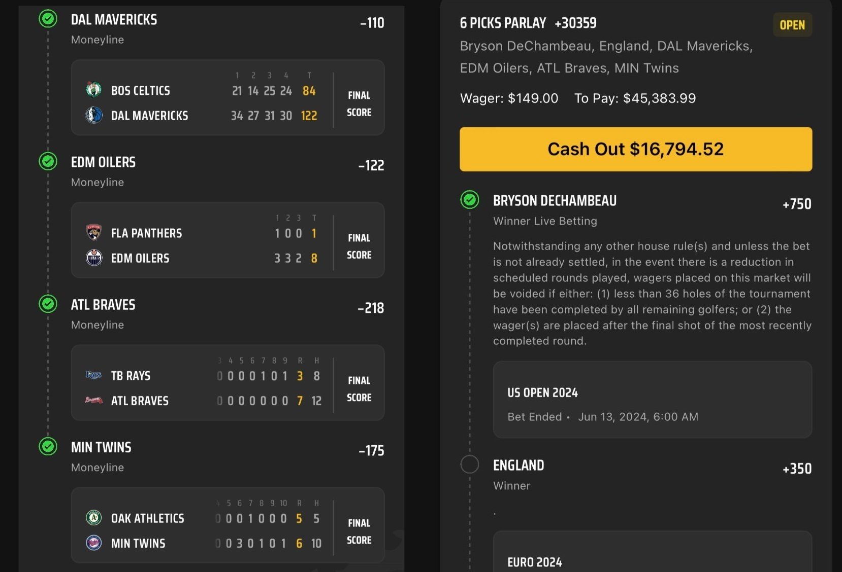 А всё потому, что 5 из 6 событий экспресса с коэффициентом 30.00 уже зашли: победа «Далласа» в одном из матчей финальной серии НБА (1.9), победа «Эдмонтона» (1.81), бейсбольных «Атланты Брэйвс» (1.45) и «Миннесоты Твинс» (1.57), а так же гольфиста Брайсона ДеШамбо на US Open-2024 (8.5).