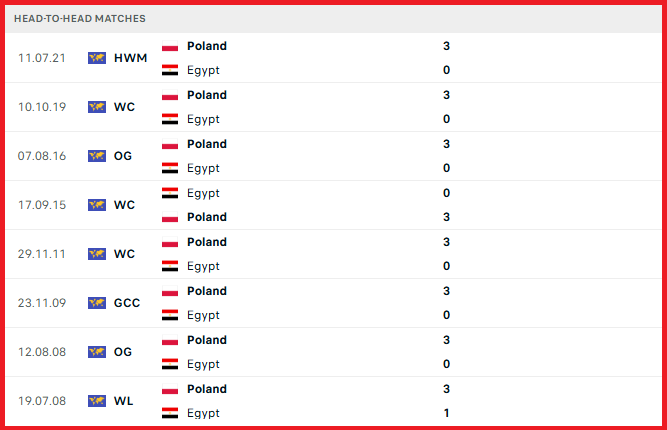 Последний раз египтяне выиграли партию у поляков в 2008 году — в предварительном раунде Мировой лиги, но игру проиграли (1-3). После — уступили ещё 7 личек подряд всухую.