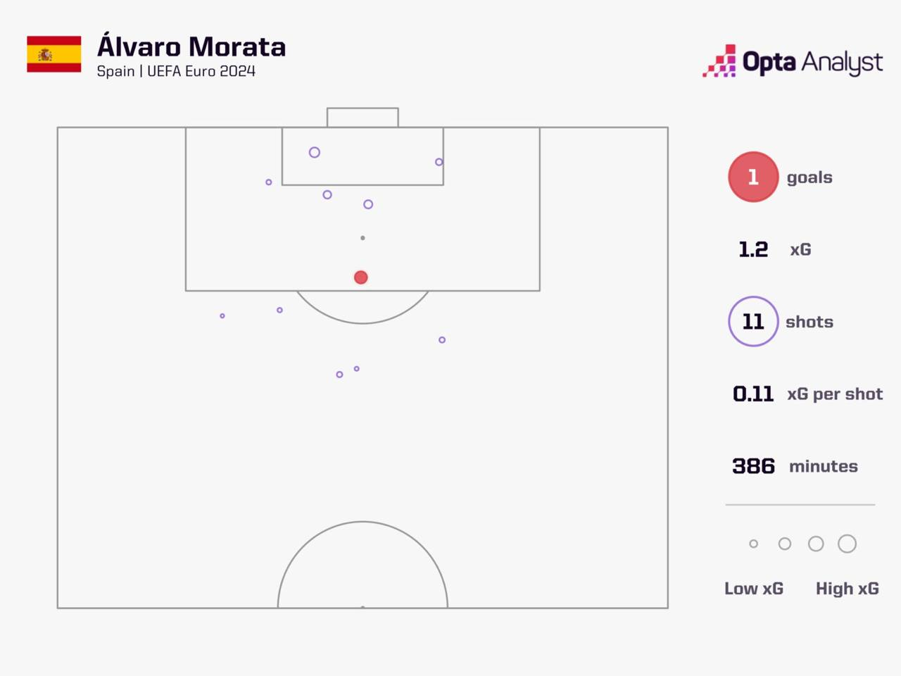 Всего за турнир у Мораты 11 ударов, в общей сложности лишь на 1,2 xG (за 6-то игр), и только один гол — хорватам в 1-м туре (357 минут без гола). Кроме того, почти половину ударов Мората нанёс из-за пределов штрафной, каждый из них был не более чем на 0,1 xG. К финалу Луису де ла Фуэнте нужно срочно что-то предпринимать: центральный нападающий, который 4 матча не может ударить в створ — это проблема.