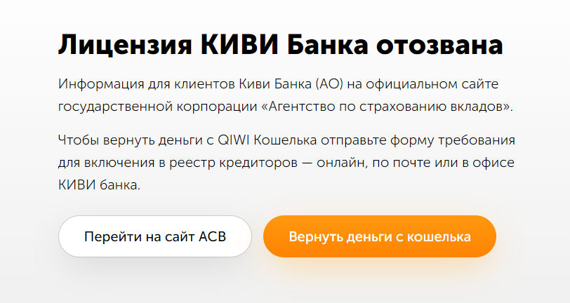 В феврале Центральный банк России отозвал лицензию у АО «КИВИ банк». Решение было принято на основе неоднократных нарушений ФЗ о банковской деятельности и невыполнения требований законодательства о борьбе с нелегальными доходами. В этот момент на сервисе хранилось 4,5 миллиарда рублей.