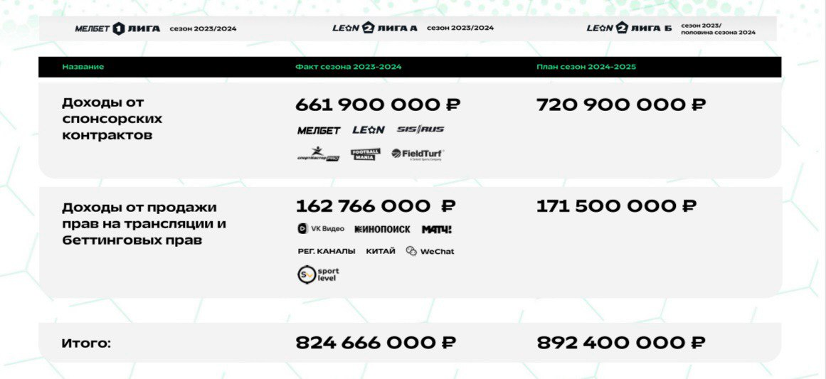 А ФНЛ — это ведь не только Мелбет-Первая лига, а ещё и Леон-Вторая лига, внутри которой есть Лиги А и Б (всё вместе — это ровно 100 клубов). Лига сообщает, что за весь сезон-23/24 спонсорские контракты (в том числе с «Мелбет» и «Леон»), а также продажа прав на трансляции и беттинговых прав принесли доход в размере 824 миллионов рублей. Ожидается, что в сезоне-24/25 эта сумма вырастет до 892 миллионов.