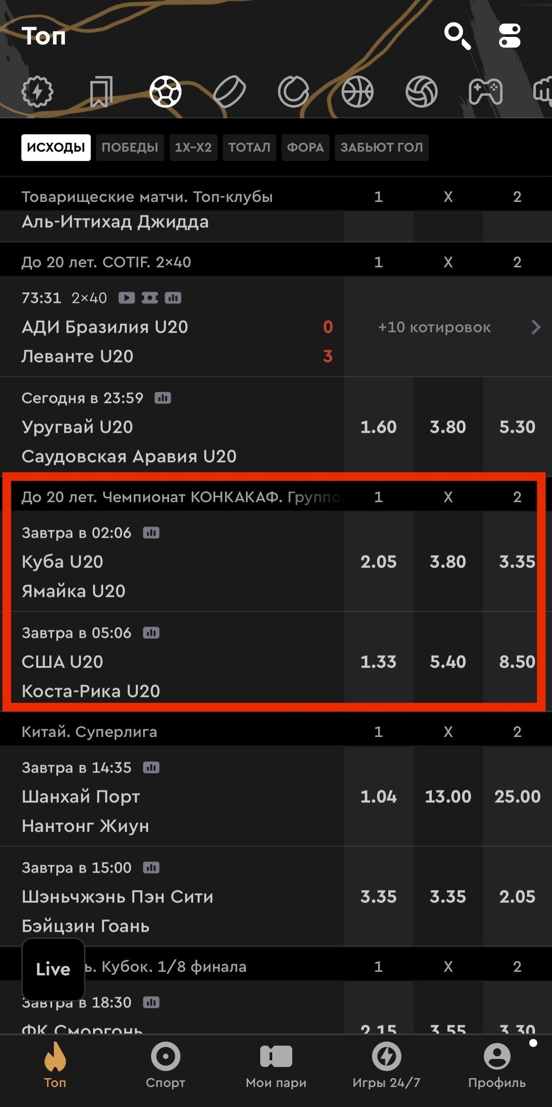 Букмекер говорит, что обе игры пройдут сегодня ночью — в 02:06 и 05:06 МСК. На самом деле Куба с Ямайкой сыграют в 23:06, то есть почти через сутки, а США и Коста-Рика вообще ночью 27-го числа.