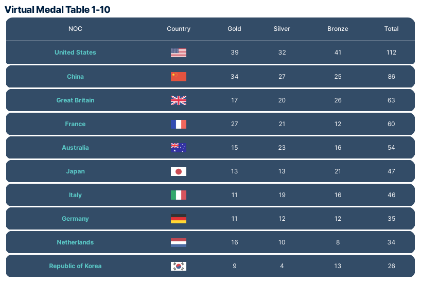 В этот раз Gracenote ждёт, что США будут первыми и по золотым медалям (наберут 39, как в прошлый раз), и по общему количеству наград (112), причём с солидным отрывом от всех. Здесь они никого не удивили — букмекеры ждут того же самого: