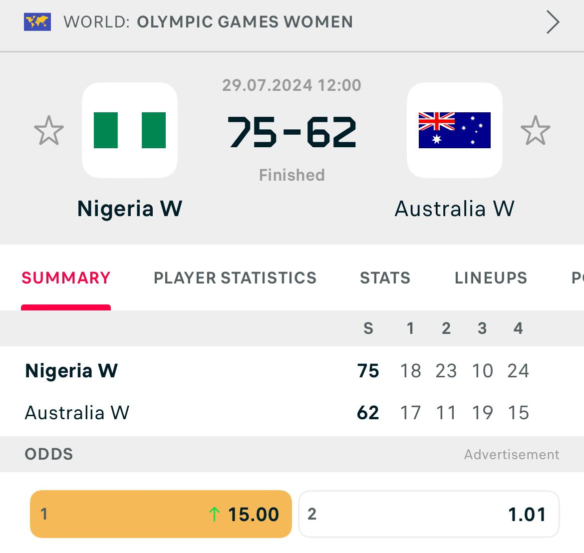 Несколько телеграм-капперов дали плюсовую фору на женскую сборную Нигерии по баскетболу в первом матче Олимпиады против Австралии — и не ошиблись. Африканки везли 13 очков после первой половины, но в третьей четверти растеряли почти всё преимущество и снова стали явными андердогами. Зато четвёртую внезапно выиграли через (-8,5) и сотворили главный апсет турнира за 15.00.