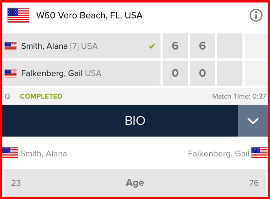 «Недавно в ITF пыталась с третьего раза начать карьеру 59-летняя Бет Герли, но так и не вышла на корт. Это очень интересный случай, но есть куда более легендарная бабушка, которая рубится в теннис — Гейл Фалкенберг, которой сейчас 77 лет.