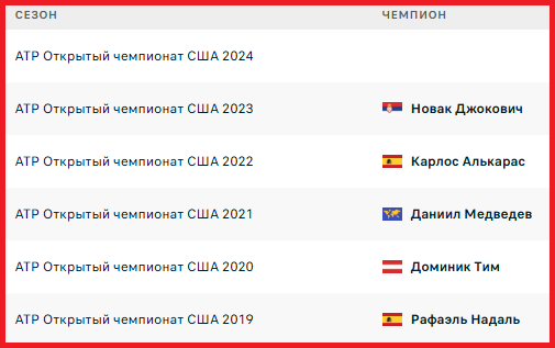 Берём последнюю пятилетку и видим неповторяющиеся фамилии чемпионов: Рафаэль Надаль в 2019-м, Доминик Тим в 2020-м, Даниил Медведев в 2021-м, Карлос Алькарас в 2022-м и Новак Джокович в 2023-м.