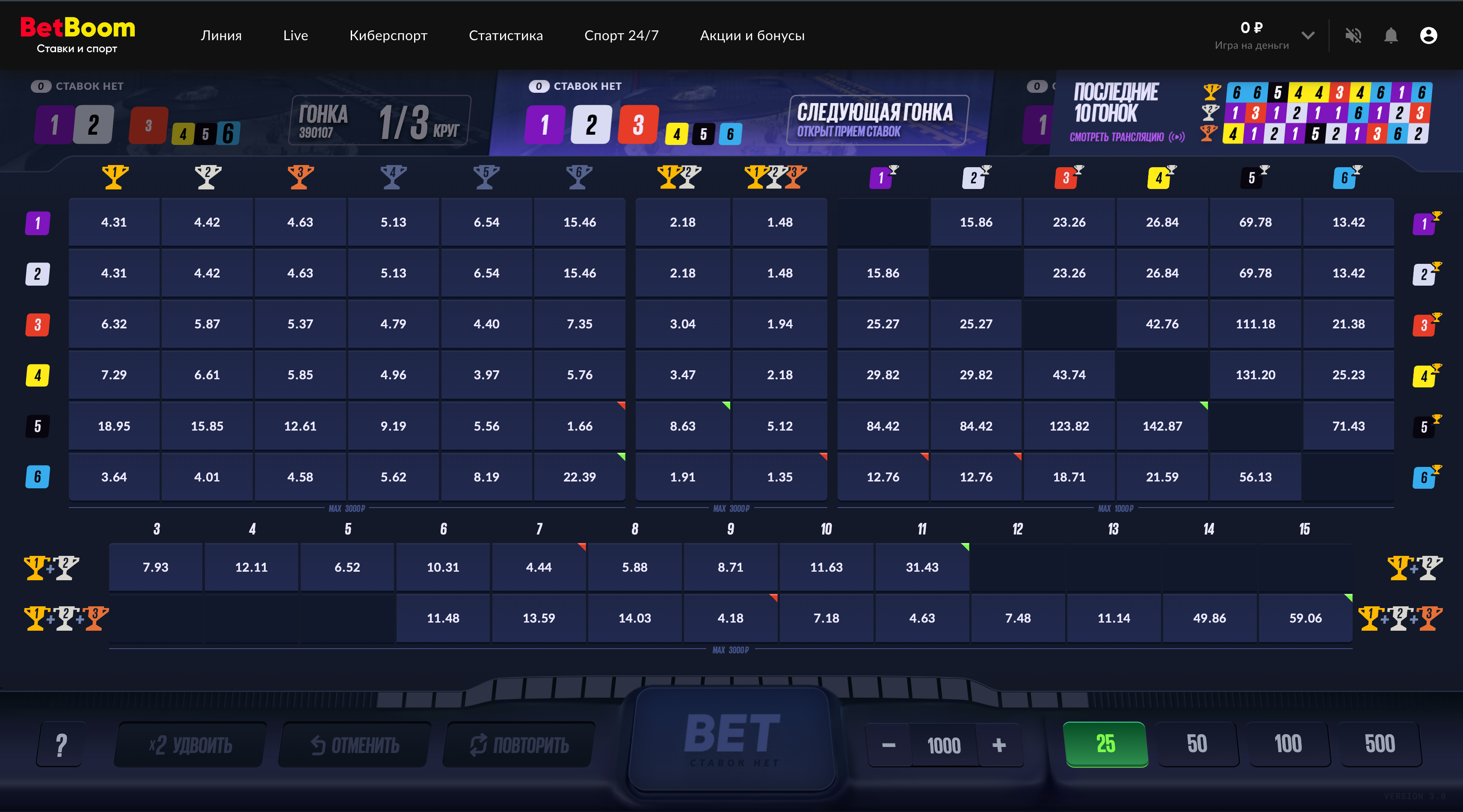 Суть проста — игра проходит в рамках турнира под эгидой Федерации автомодельного спорта Армении. В гонках принимают участие шесть моделек, а управляют ими гонщики, получившие допуск от федерации. Клиенты BetBoom могут поставить как на результат определённого заезда, так и на исход всего турнира, в рамках одного пари можно зарядить от 25 рублей, максимум — 3000 рублей.