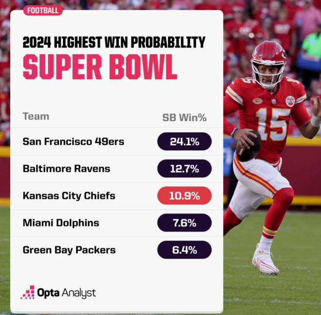 «Канзас-Сити Чифс» уже на двухлетнем тренде, но теперь, по расчётам Opta, подходят к новому сезону с шансами в 10,9% на чемпионство — третий показатель среди всех команд. Основной фаворит, по мнению аналитического центра, — «Сан-Франциско», его шансы оцениваются в 24%, вторым в списке идёт «Балтимор» с 12,7%.