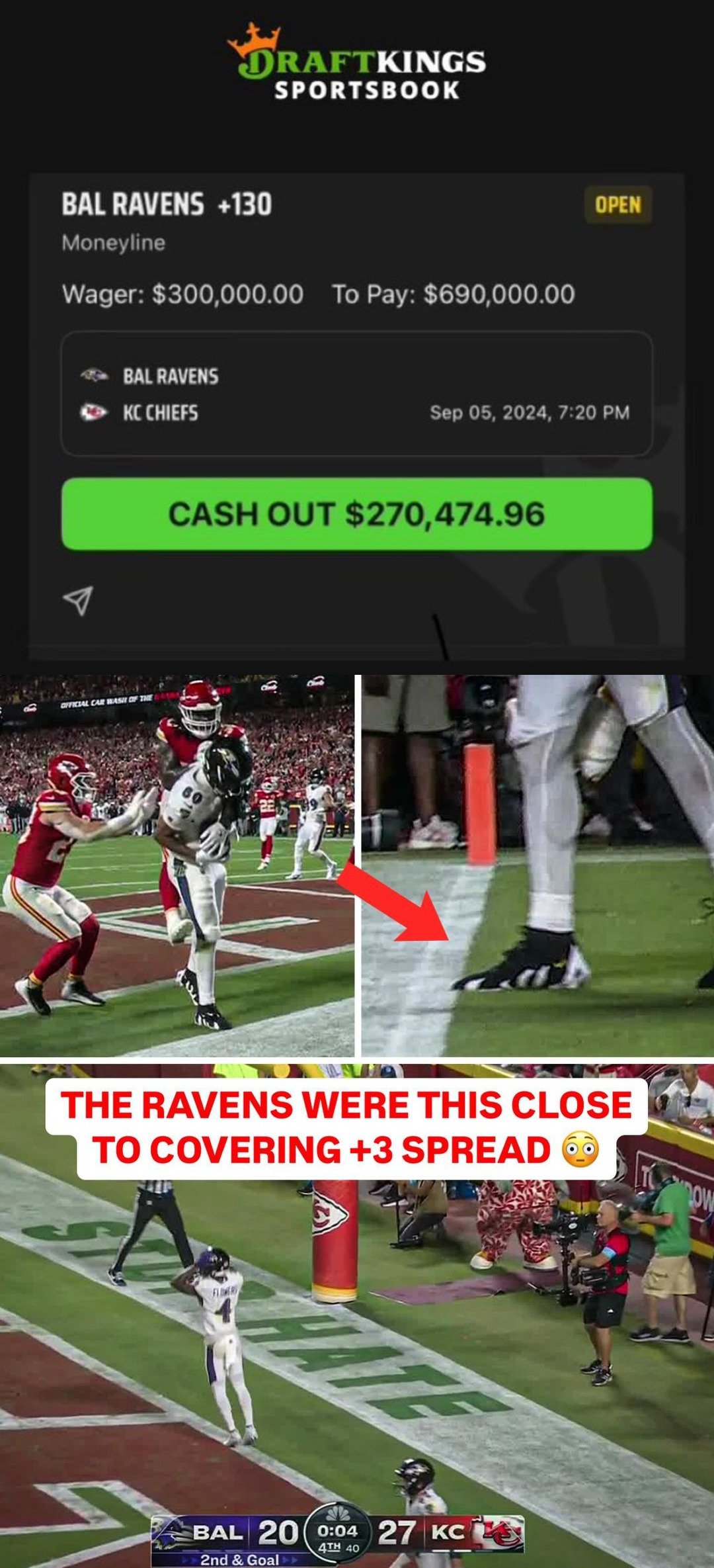 Насколько риск оправдан — судить не нам, но пари заслуживало пожить хотя бы до овертайма. За четыре секунды до конца основного времени «Рэйвенс» не хватило нескольких сантиметров до тачдауна и бонусного удара — нападающему требовалось внести мяч в очковую зону, но при получении мяча случился заступить на линию.