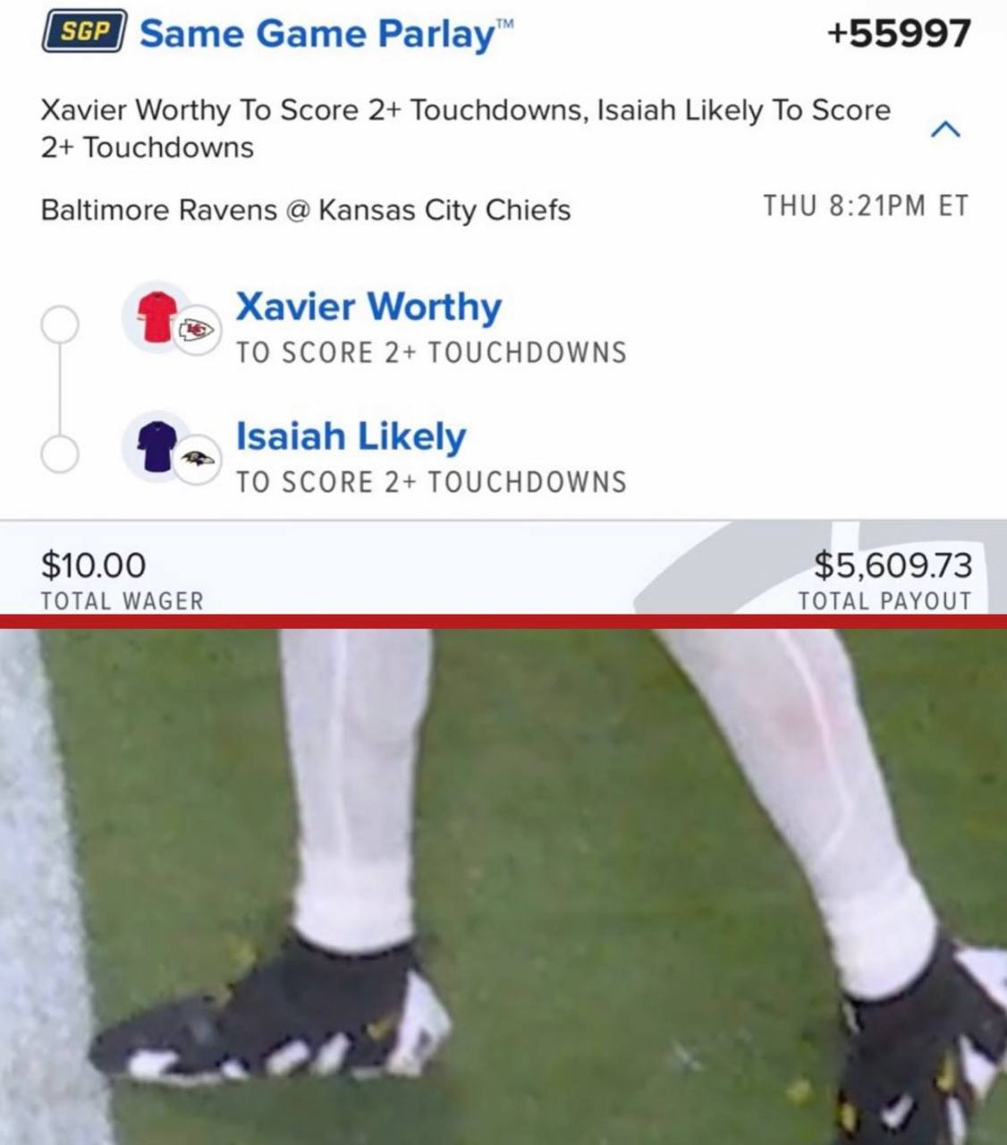 Только этот игрок пошёл иным путём — закинул в двойник не самые очевидные события, которые и по одиночке-то вряд ли зашли бы: по два тачдауна от Ксавье Ворти и Исайя Лайкли в матче «Канзас-Сити Чифс» и «Балтимор Рэйвенс». И был крайне близок к успеху!