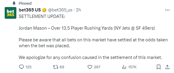 История была следующая: игрок поставил на то, что Джордан Мэйсон наберёт больше 13,5 ярдов на выносе в матче «Нью-Йорк Джетс» — «Сан-Франциско». Ставочка успешно доехала, но к утру клиенту пришло письмо: примите наши соболезнования, но, к сожалению, коэффициент был некорректным, и мы вынуждены его поменять с 1.90 (−110 в американском варианте) на... 1.02.