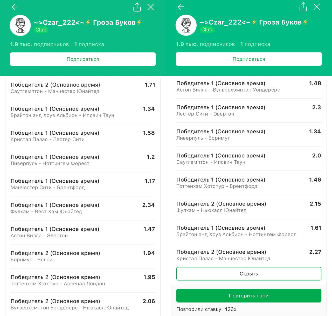 И в рейтинге «горячих повторов» сегодня на первом месте — человек с говорящим ником «~>Czar_222<~⚡️Гроза Буков⚡️». Его ставки реально пользуются бешеной популярностью: например, экспресс на ближайшие два тура РПЛ с коэффициентом 268 повторили уже 380 человек. Но есть кое-что ещё круче: он собрал 19 матчей АПЛ в один паровоз, на который сейчас предлагается кэф 38491 — и эту дикую ставку повторили уже 426 игроков! Причём их количество растёт практически каждую минуту: