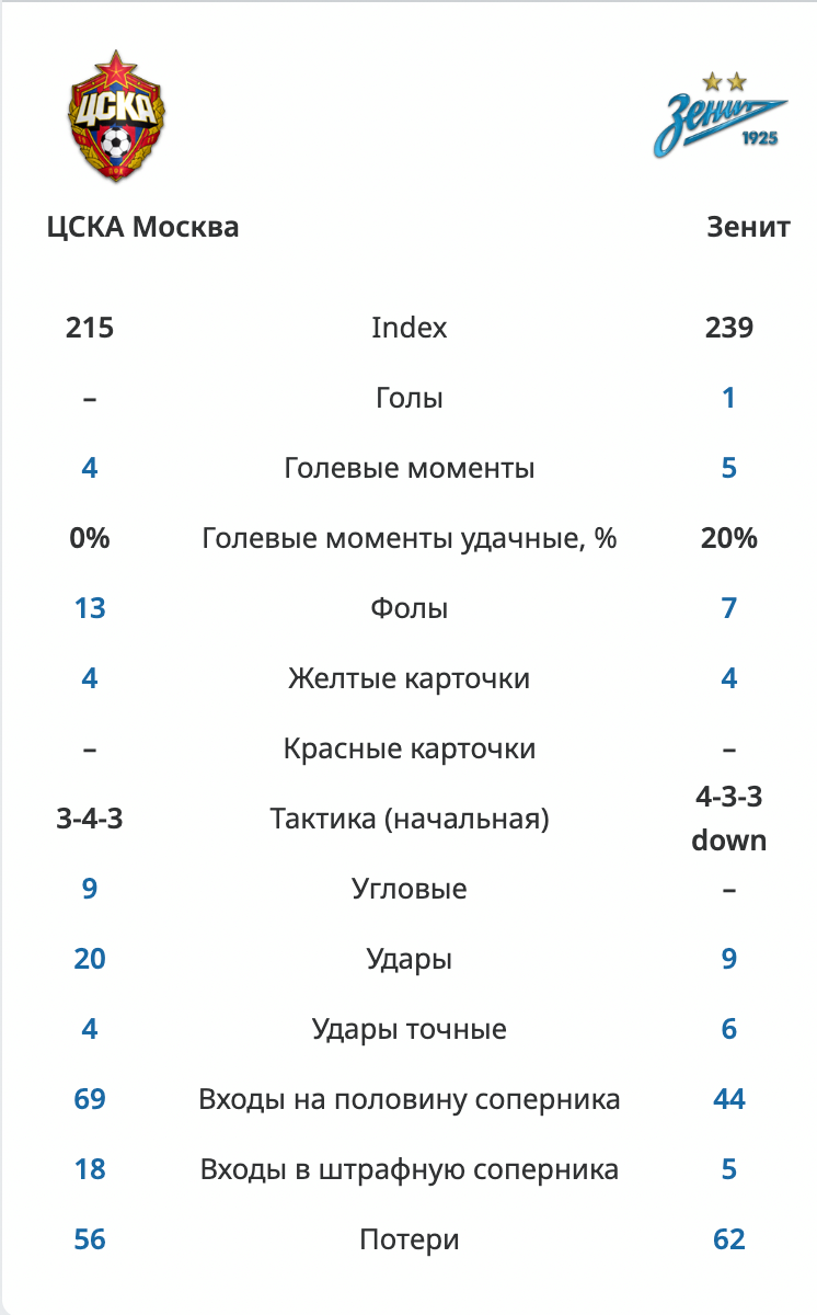 Победу со счётом 1:0 одержал «Зенит», а вот и официальная статистика матчу от РуСтат: