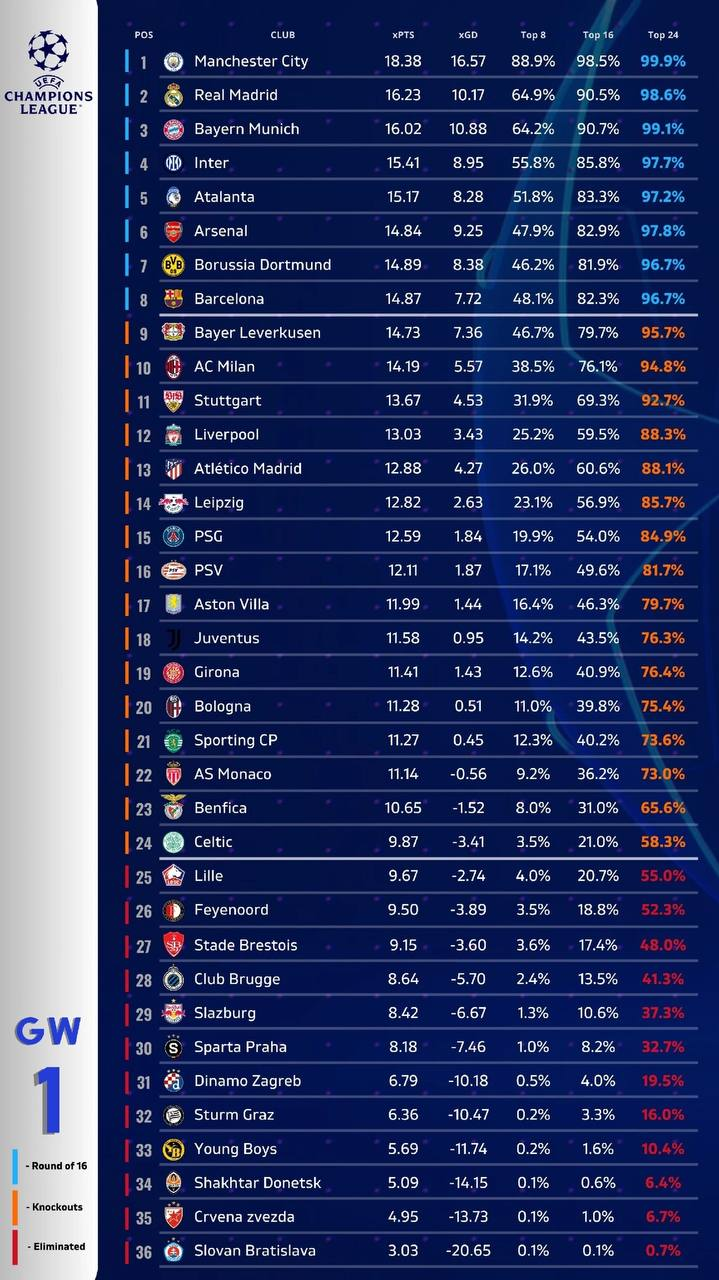 Power Rankings — чуть менее известная машина, чем Opta, но тоже вполне себе популярная и авторитетная. А самое главное, что эта модель (в отличие от Opta, кстати) выдала полноценный прогноз на общий этап ЛЧ вплоть до ожидаемого количества набранных очков для каждой команды — нам такое изучить всегда интересно.