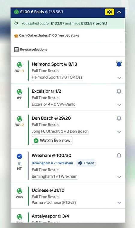 А на этой неделе благодаря заморозке у одного из клиентов зашёл фрибетный экспресс из шести событий с кэфом 140: последним и самым дорогим событием была победа «Рексхэма» над «Бирмингемом» в гостях за 4.30 — «Рексхэм» повёл уже на третьей минуте, и игрок моментально заморозил матч. Учитывая, как развивались события в других встречах из экспресса — полностью понимаем: «Хельмонд» закатил победный мяч на 90+2-й, «Антальяспор» — на 90+8-й, а «Удинезе» выиграл 3:2, уступая 0:2 к перерыву.