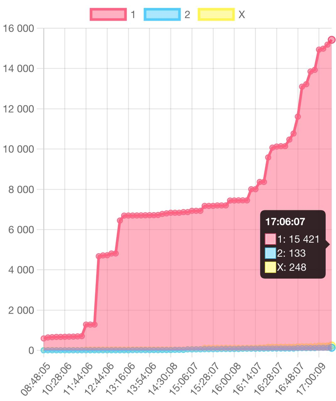Несмотря на отсутствие лучшего страйкера, народ массово грузит на «Шахтёр»: 97% от общего объёма ставок на исходы — именно на П1. А один экстремал даже воткнул 3390 долларов по коэффициенту 1.15.