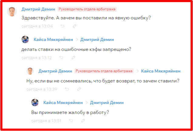 Пользователь уверен, что в случае выигрыша пари бы пересчитали возвратом, а тут БК всё устроило. И самое забавное, что жалоба стала третьей с профиля по поводу ошибок — две другие зашли, но по итогу логично получили 1.00:
