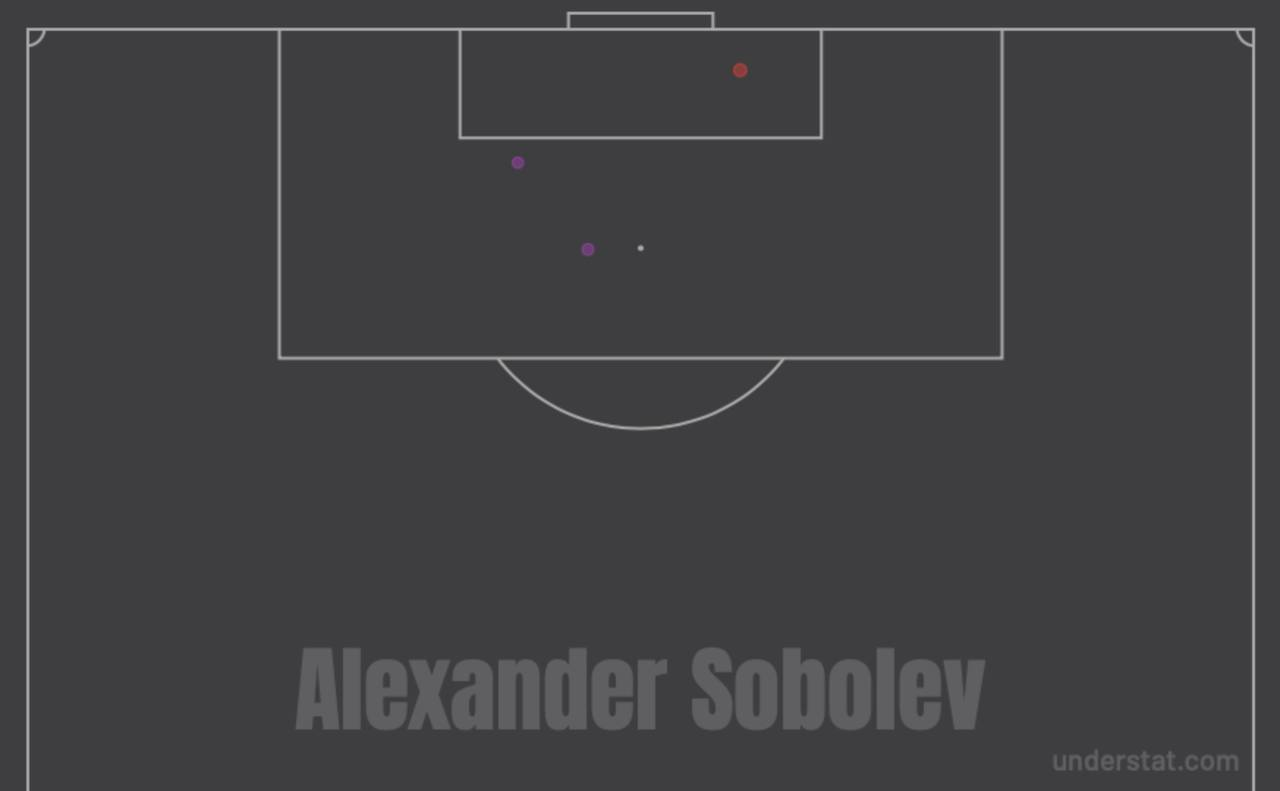 Если копнуть чуть глубже, может стать совсем грустно. За 128 минут чистого времени Соболев ни разу даже не пробил в створ, согласно данным Understat. Красная точка — заблокированные удары, фиолетовые — мимо.