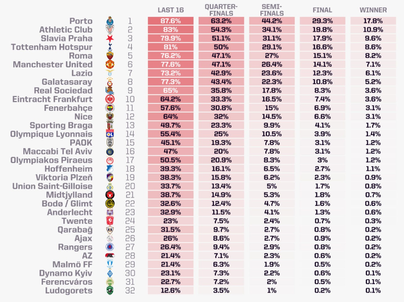 1. Фаворит — «Порту», причём с достаточно высокими шансами — 17,8%. Если конвертировать процент в коэффициент, а ещё заложить профит, выйдет меньше 5.00 — букмекеры же котируют португальский клуб аж шестым по 13.00