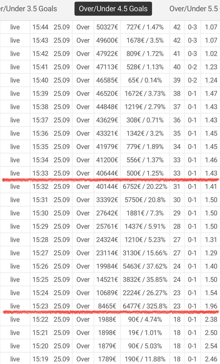 Другой рынок, вызвавший повышенный интерес в эти же минуты — ТБ 1,5 в первом тайме, на который с 22-й по 37-ю минуту нагрузили почти 40 тысяч евро. За восемь минут до конца тайма на гол давали всего 1.63! Забили даже два в самой концовке — к перерыву «Волос» вёл 3:0.