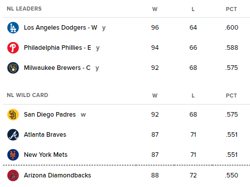 Топ-4 в Национальном дивизионе уже определилась — открытым остаётся вопрос по пятому и шестому местам, которые попадают в так называемую wild-card серию — отборочный раунд плей-офф. Претендуют на них три команды — «Атланта Брэйвс», «Нью-Йорк Метс» и «Аризона Даймондбэкс».