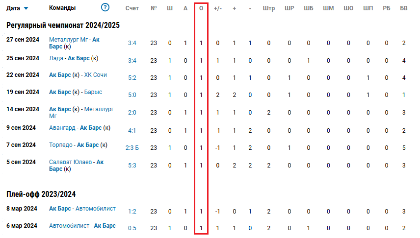 Нападающий «Ак Барса» начал результативную серию ещё в плей-офф прошлого сезона — в последних двух матчах против «Автомобилиста». В регулярке этого года продолжил набирать строго по баллу.