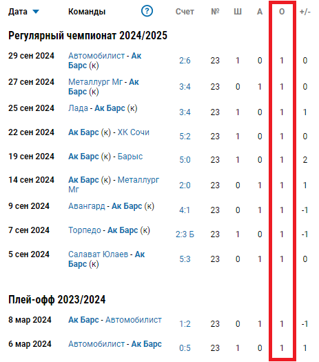 Нападающий «Ак Барса» начал результативную серию ещё в плей-офф прошлого сезона — в последних двух матчах против «Автомобилиста». А в регулярке этого года продолжил набирать строго по баллу — уже девять игр подряд.