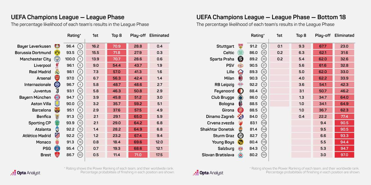Самый вероятный член топ-8 — всё та же «Боруссия», возглавляющая турнирную таблицу после двух побед с общим счётом 10:1. «Дортмунд» будет в первой восьмёрке — 71,8%, если верить Opta, и аж 1.60