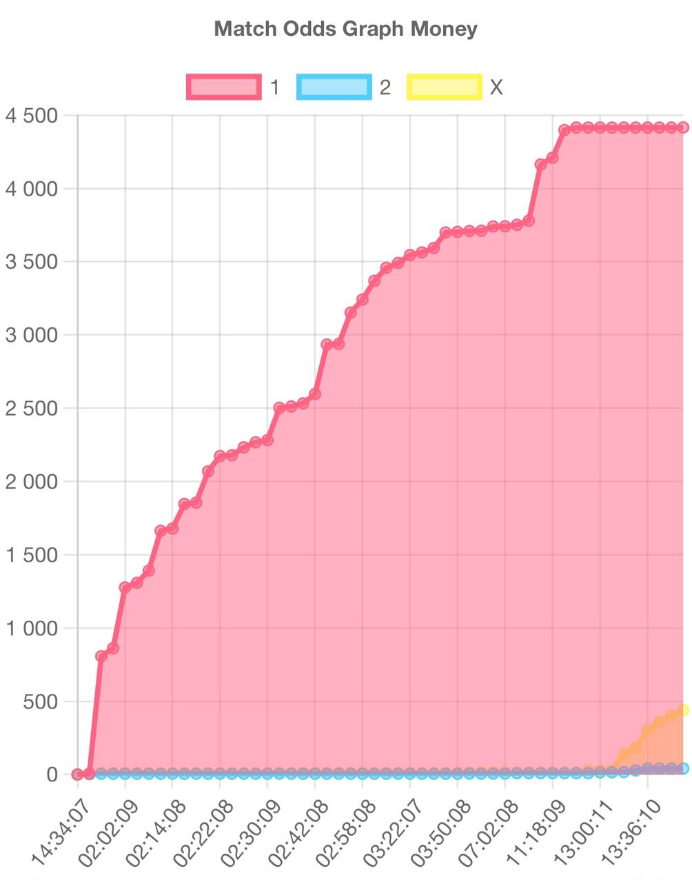 Дальше денежный поток на хозяев закрылся так же резко, как и открылся: за следующие 11 часов на фаворита поставили суммарно меньше 1000 евро, то есть сейчас на «Коммершл Бэнк» нагружено почти 4500 евро — в сотню раз больше, чем на гостей. Всего же на этот матч поставлено около 6000 евро — это в пару раз больше, чем даже на некоторые сегодняшние игры ЛЕ и ЛК.
