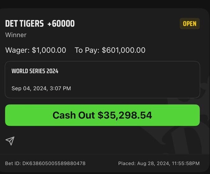 «Тайгерс» 10 лет не могли выйти в плей-офф, а чемпионом не становились аж с 1984-го. Но игрока это ничуть не смутило, и он закинул тысячу баксов на коэффициент 601.00 — так, видимо, чисто поболеть за своих.