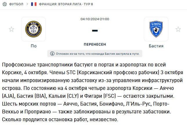 У «Бастии» из одноимённой корсиканской коммуны банально не осталось транспорта для отправки на матч — ни по воздуху, ни по воде. Так что сегодняшнюю встречу можно смело вычёркивать из экспрессов.