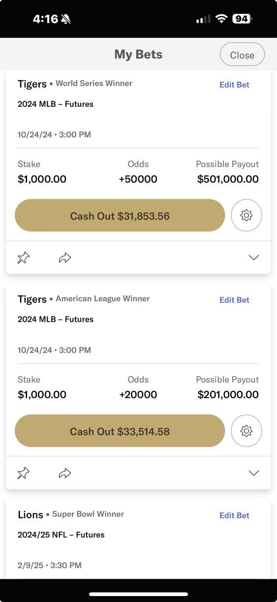 Вчера мы писали, что кто-то зарядил $1000 на победу «Детройта» в Мировой серии с коэффициентом 601.00. Сегодня обнаружилась ещё пара таких ставок. Клиент BetMGM поделился двумя ординарами — оба тоже на 1000 долларов. Только с коэффициентами 501.00 и 201.00.