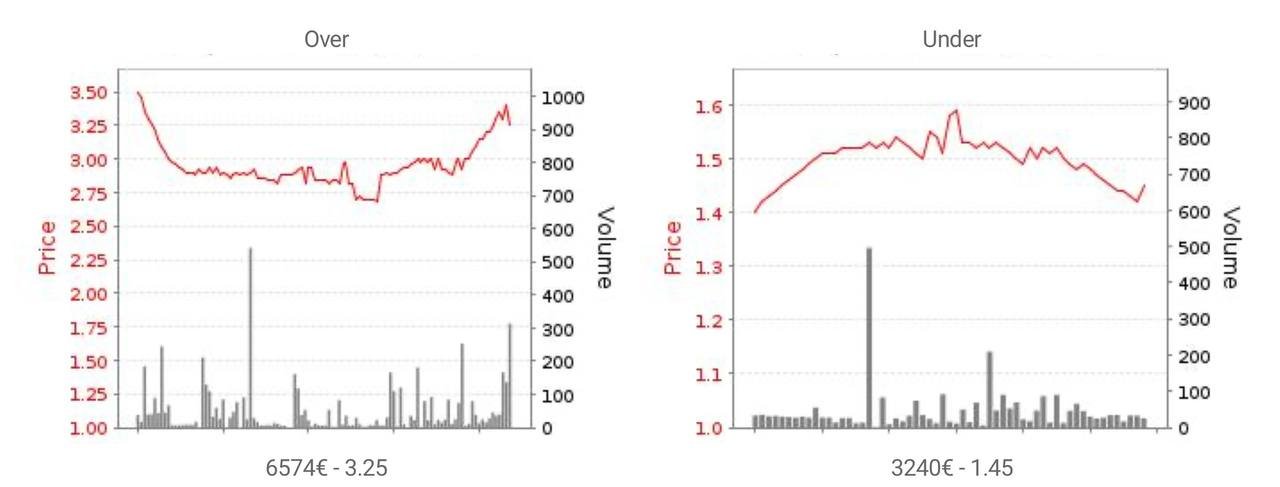 И вот спустя две недели происходит ровно то же самое в том же втором дивизионе Колумбии, только команды другие — «Богота» и «Тигрес». На матч по бирже excapper поставлено в общей сложности более 11 тысяч евро (для сравнения, на игру «Энвигадо» — «Букараманга» в высшей лиге Колумбии стоит всего 2000), из них 10 — как раз на тот самый рынок, 1,5 гола в первом тайме: 6600 — на ТБ 1,5, 3300 — на ТМ 1,5. На трёхисходку в этом матче загружено меньше 1000 евро.