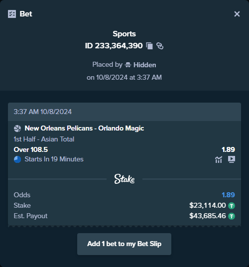 Игрок захотел поднять 20 тысяч долларов чистыми, поэтому загрузил на предсезонную встречу «Пеликанс» и «Мэджик» 23 тысячи. Требование — минимум 109 очков в первой половине.