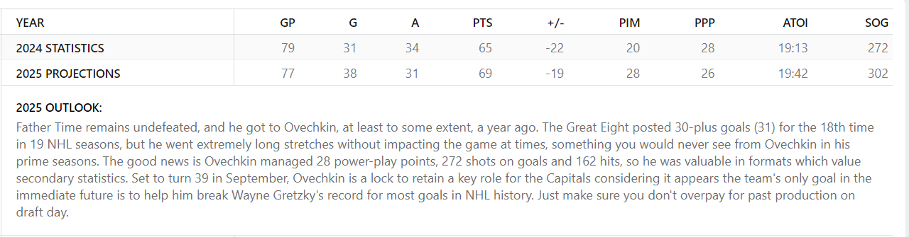 У американского спортивного ресурса ESPN есть своя фэнтези-лига, и перед стартом сезона аналитики сайта выкатили свой прогноз на результативность самых топовых игроков НХЛ — чтобы легче было сориентироваться при наборе команды в фэнтези. Естественно, спрогнозировали и результаты Александра Овечкина в сезоне-24/25.