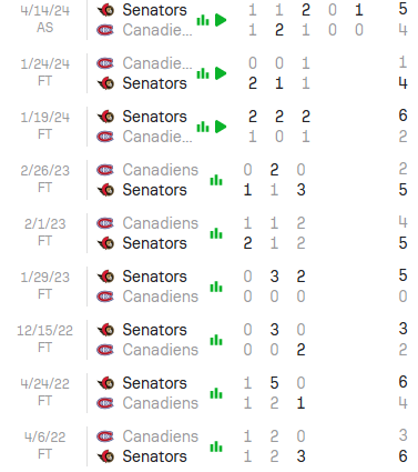 Дважды «Сенаторс» доходили до столь же длинных периодов побед над одним и тем же соперником — девятиматчевые против «Баффало» (2009-10) и «Филадельфии» (2010-12). Но 10 раз в ряд канадцы не расправлялись ещё ни с кем. Уже ночью «Оттава» встретится с «Монреалем», который вместе с предсезонкой проиграл пять из шести игр.