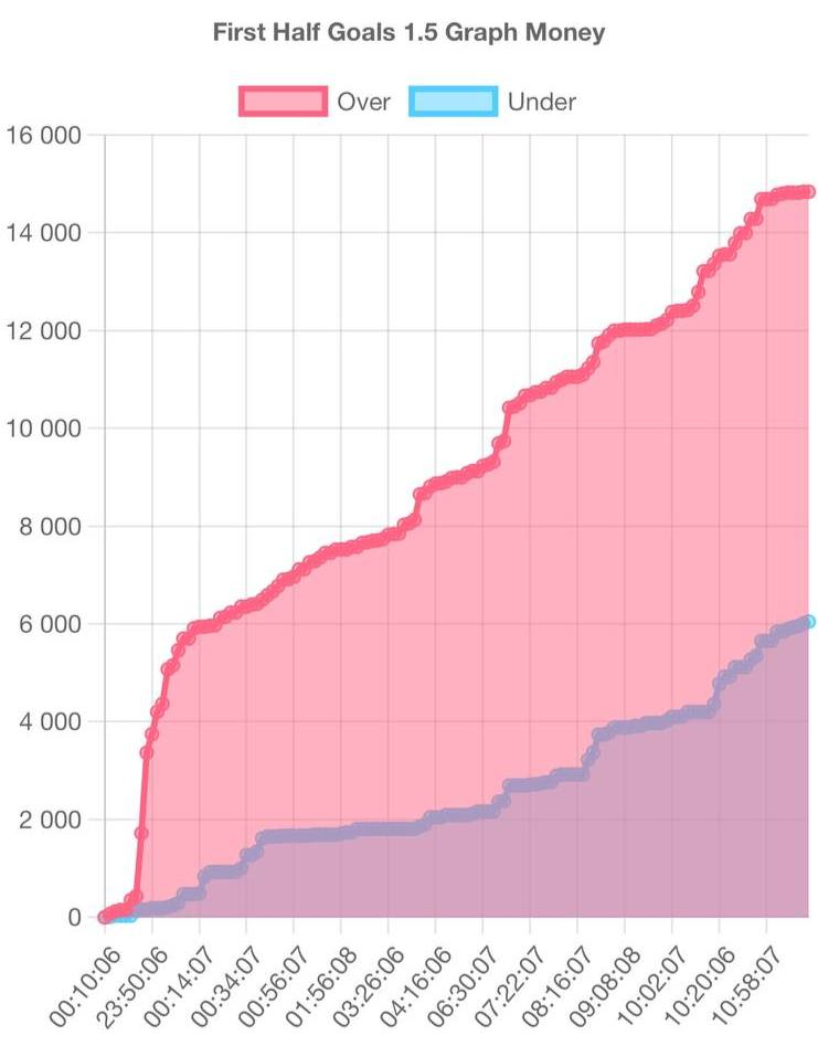 При этом распределялись ставки почти одинаково: примерно 60% всей суммы, загруженной на матч — на ТБ 1,5 до перерыва, 30% — на ТМ. Всё остальное — трёхисходки, тоталы матча и прочее. И вот чем это заканчивалось: