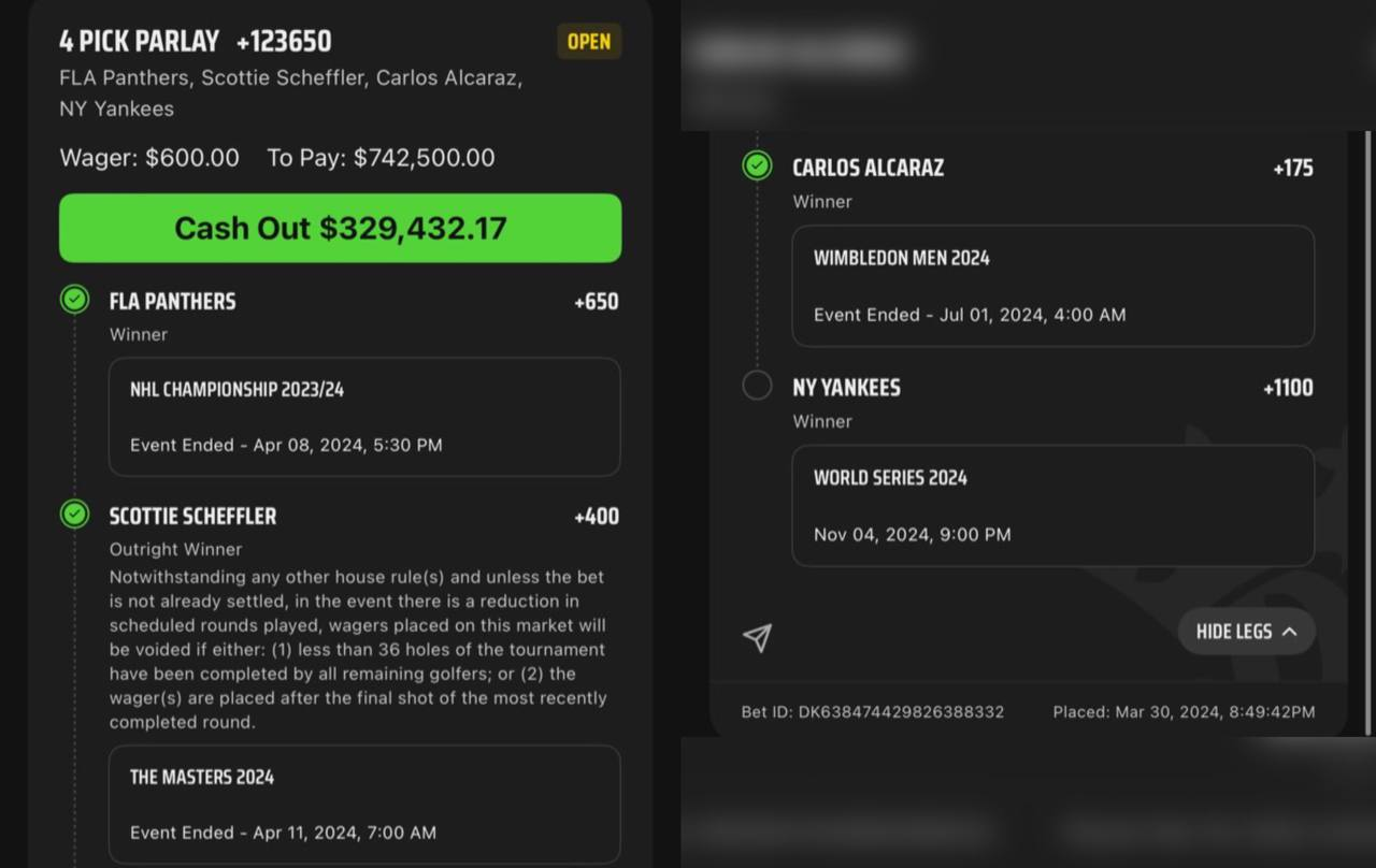 Прежде всего, зарядить почти 60 тысяч рублей на коэффициент 1237 — уже безумно само по себе. Но ещё безумнее растянуть этот экспресс почти на год: этот человек сделал ставку 30 марта — и она всё ещё в пути, но три события из четырёх уже зашли: