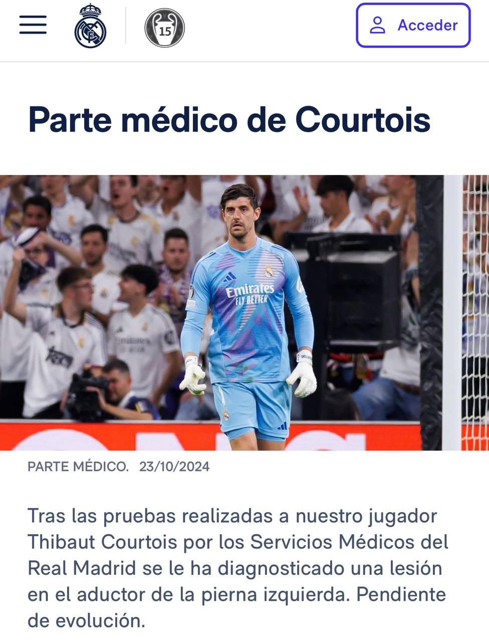 Как сообщил официальный сайт «Реала» ещё в среду, у вратаря диагностировали травму приводящей мышцы левой ноги после матча с «Боруссией». Куртуа выбыл на две-три недели и не попал в заявку на игру с «Барселоной» .